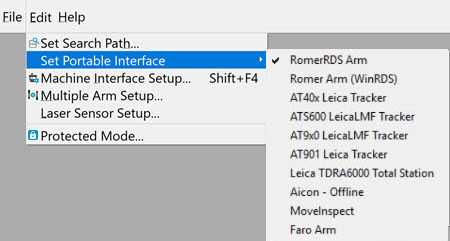 最初のPC-DMIS画面でメニューから、編集 | ポータブルインターフェイスの設定をクリックします。