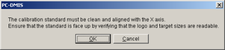 [校正]ボタンをクリックします。ソフトウェアは校正基準がクリーンでかつ X 軸に沿っている必要があることを知らせるメッセージボックスを表示します。また、基準が上を向いているか確認する必要もあります。