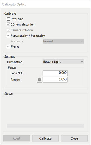焦点 - レンズN.A. - 既知の場合、現在のレンズの開口数(N.A.)を指定し、既知でない場合、このボックスは空白になります。この値を使用すると校正プログラムが校正中に使用するフォーカスを最適化できます。