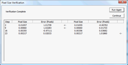 [ピクセルサイズ検証] ダイアログボックスが表示されたら、[再実行] をクリックして検証を再実行できます。これは、エラーが単に検証上の例外であるかどうかを判断するのに役立ちます。検証が何度も失敗する場合、ピクセルサイズの校正全体を再実行してみてください。校正と検証の両方が何度も失敗する場合は、Hexagon 社のテクニカルサポートにお問い合わせください。