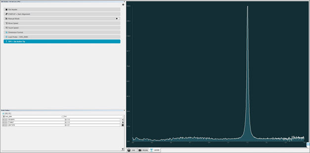 クロマチック白色光センサー(CWS)が測定ルーチンのアクティブプローブである場合、PC-DMIS Visionはスペクトラムプロットを含むレーザータブを追加します。ソフトウェアが測定ルーチンを実行していない場合、スペクトルプロットはCWS信号の構造(「ノイズ」)を示します。これは、照明や周波数などのパラメータの最適な設定を選択するのに役立ちます。