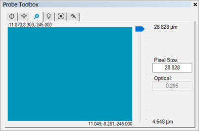 [0]= - これは、現在の倍率のレベルを(ピクセルサイズ) 反映する数字をオーバーレイ表示します。パートにズームインするほど、この数字のサイズは小さくなります。数字がゼロに近づくほど、測定機は最大倍率に近づきます。これは、プローブ・ツールボックスから[倍率]タブを選択した場合にのみ画面に表示されます。