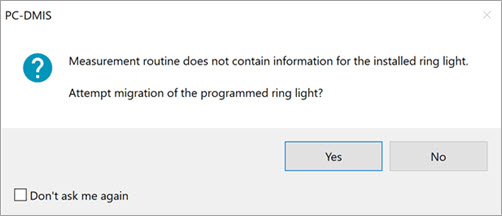 PC-DMISオンラインでは、ある測定機から別の測定機上で異なるリングライト構成の測定ルーチンを実行すると、ソフトウェアがこれを検出し、リングライト設定を新しい設定に一致するように移行するかどうかを尋ねます。