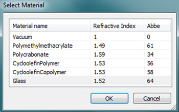 必要に応じて屈折率の値を編集します。[編集]ボタンをクリックして[材料の選択]ダイアログボックスを開きます。その後、現在の値を確認または更新できます。