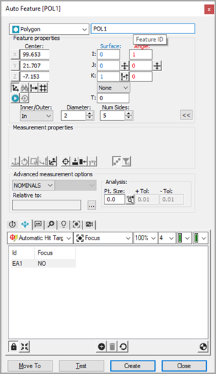 PC-DMIS Visionは自動的に自動要素ダイアログ ボックスに多角形の公称データを配置します。ヒットのターゲットが自動的に多角形に対して表示されます。