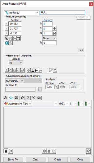 PC-DMIS Visionは自動的に自動要素ダイアログ ボックスに2D輪郭の公称データを配置します。ヒットのターゲットが自動的にプロファイル2Dに表示されます。