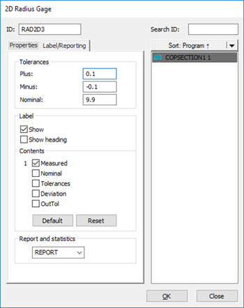 2D 반경 게이지 대화상자 - 레이블/보고 탭