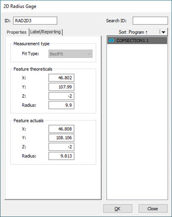 특성의 실제값 - 소프트웨어는 XYZ 중심점과 측정된 반지름의 크기를 보여준다. 실제값을 수정할 수 없다.