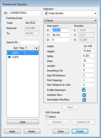COP를 입력으로 만들어진 단면의 경우, 점구름 연산자 대화상자를 보여주기 위해 삽입 | 점구름 | 연산자 를 클릭한다.