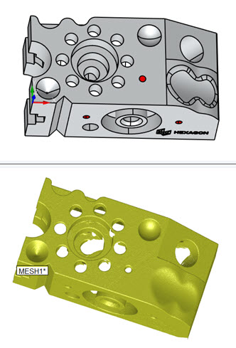 상단 뷰의 CAD 모델과 하단 뷰의 메쉬를 보여주는 분할 화면 뷰