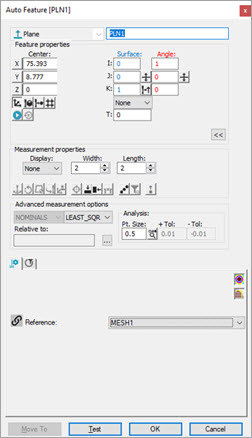 측정 루틴에 메쉬가 하나만 있는 경우, PC-DMIS는 참조 데이타 개체로 메쉬를 기본값으로 사용한다. COP (또는 둘 이상의 COP)와 하나 이상의 메쉬 데이타 개체가 있는 경우, 프로브 도구상자의 특성 수집 탭의 참조 목록에서 올바른 참조 데이타 개체를 선택해야한다.