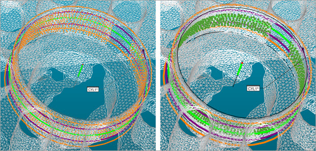 PC-DMIS가 메쉬 데이타 개체에서 레이저 자동 특성을 수집할 때, 그것은 먼저 수평 및 수직 절단으로 정의된 수집 영역 내부의 모든 삼각형 정점을 고려한다. 수집 영역 내에 있는 지점을 보기위해, 레이저 스캔 속성 탭에서 분리된 지점 보여주기/숨기기 버튼 (