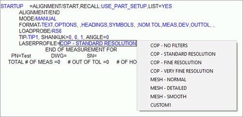 CMM 사용자의 경우, 측정 루틴이 이미 레이저 프로파일 명령을 포함하고 커서가 편집 창에서 해당 명령 아래에 있는 경우, 다음 시나리오가 적용된다: