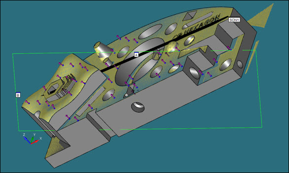 스캔에 포함하고자하는 표면 위 화면의 직사각형을 클릭하고 끈다. 이 직사각형은 그리드의 경계를 정의한다. 경계가 CAD 표면에 투영된다. PC-DMIS는 직사각형을 그릴 때 선택한 표면의 CAD 모델에 점을 그린다.
