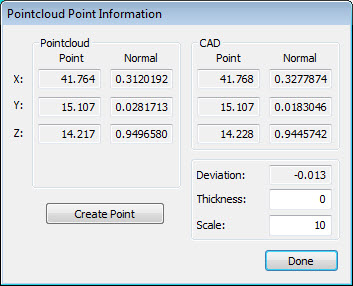이 대화상자에서, 점구름 지점을 위한 XYZ 와 법선 지점 벡터 값, 또한 선택된 지점을 위한 ID 를 볼 수 있다. 그것은 해당 XYZ 와 법선 벡터 값을 또한 보여준다.