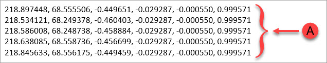 데이타 파일은 각 지점의 XYZ 또는 XYZIJK 값을 정의한다. 이들 데이타 유형의 경우, PC-DMIS가 표면 Colormap 과 특성 수집 같은 점구름 작업에서 지점의 벡터를 사용하기 때문에 XYZIJK가 더 좋다. 다음의 예는 XYZIJK 값이 있는 지점을 보여준다.
