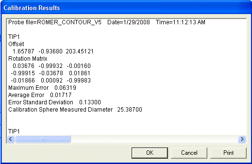 조정이 PC-DMIS 설정 편집기의 USER_Option 부분에서 StandardDeviationLimit 항목을 위해 정의된 공차 값을 초과하면, PC-DMIS는 조정 결과 대화상자에서 "프로브 조정의 표준 편차가 한도를 초과"라는 텍스트의 라인을 추가한다.