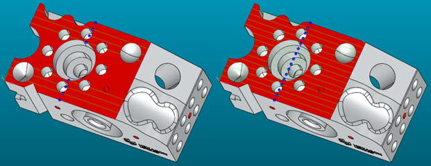 인접면 표시란 - 이 옵션은 선택한 면과 경계를 공유하는 모든 면을 선택한다. 인접한 면 사이에 CAD의 불변의 정확도보다 큰 간격이 있는 경우, PC-DMIS는 그 면들을 선택하지 않는다.