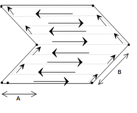 PC-DMIS 는 방향 1 Tech 영역에 의해 나타난 면에서 부품을 스캔할 것이다. 그것이 두번째 경계 지점에 도달했을때, PC-DMIS 는 자동으로 방향 2 Tech 영역에 나타난대로 다음 행으로 이동할것이다.