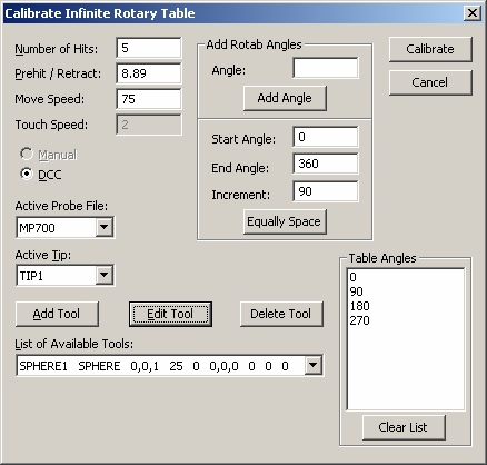 새 조정 도구를 정의하기 위해 도구 추가 를 클릭하거나 기존 조정 도구를 변경하기 위해 도구 수정 을 클릭한다. 상세 정보는, PC-DMIS 핵심 문서의 "하드웨어를 정의" 장에서 "도구 추가" 항목을 본다. 도구의 위치는 기계 좌표에서 회전 테이블의 영도에 있다. 도구 위치를 결정하기위해, 프로브의 "상단" 가까이서 프로브를 이동하고 계수기를 읽은 다음 프로브 반경을 축 중 하나에 더하거나 뺀다. 마지막 단계는 테이블과 관련된 프로브의 방향에 따라 달라진다.