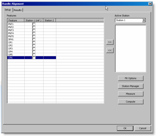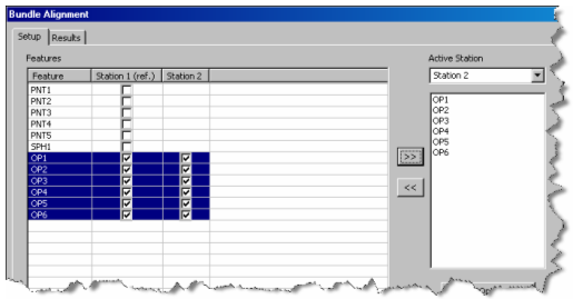 스테이션 1 아래에서 측정된 특성들을 보여주는 그룹 좌표일치 대화상자