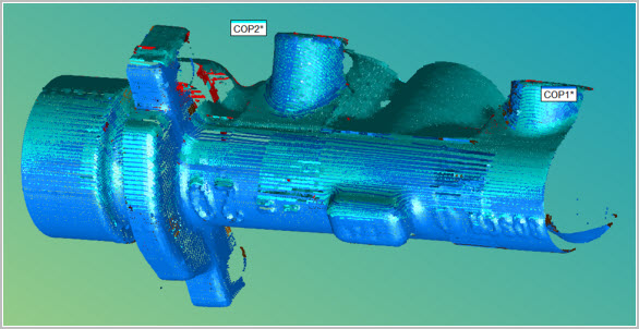 使用点云至点云坐标系功能可最佳拟合对齐收集在两个不同参考框架中的拥有相同重叠的两个点云。典型示例为两个点云命令中的两个扫描,这两个扫描表示无法以相同零件方向扫描的零件区域。