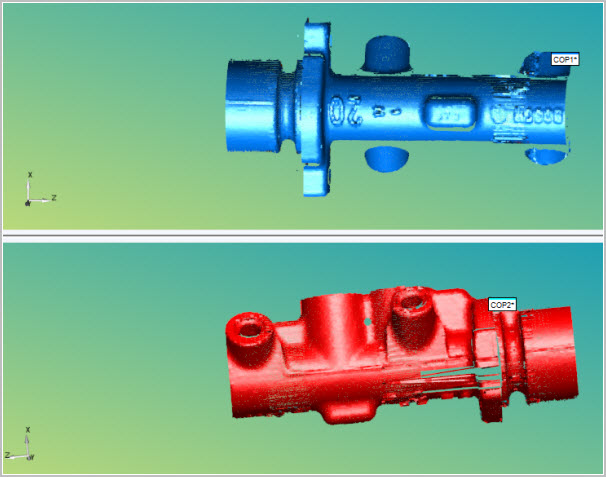 两个点云的临时拆分屏幕视图会出现在“图形显示”窗口中。您可以使用此视图直观地看到坐标系。从参考列表中选择要用作参考点的第一个COP。