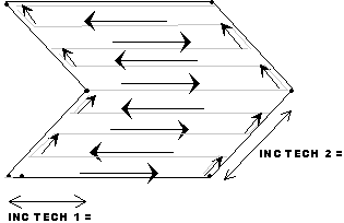 片区扫描方法根据扫描参数扫描零件曲面。(片区扫描类似一系列彼此平行的开放路径。)进行每条扫描线时,测头始终保持在切割平面内。该法使用增量值确定每条线上的点距。当扫描到达行末的边界时,扫描将按照增量 2 的值移至下一行,并从反方向开始新的扫描线。下图描述了此过程。
