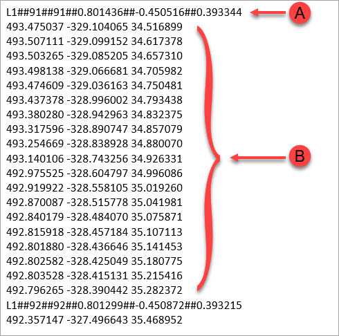 数据中每个激光条纹、线条或贴片定义了条纹的向量 (IJK),然后是条纹上点的 XYZ 值。点XYZ值可以用空格分隔或用逗号分隔。