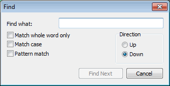 编辑 | 查找和代替 | 查找菜单选项打开查找对话框,这个允许用户查找在编辑窗口中一个指定的值。