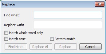 编辑 | 查找和代替 | 替代选项与查找选项相同(参见"查找")。与不过,在找到文本后,可以使用 替换 对话框替换文本。