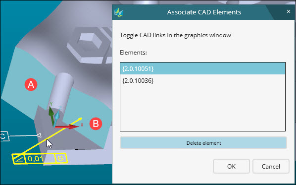 GD&T callout now associated to both elements (A and B)