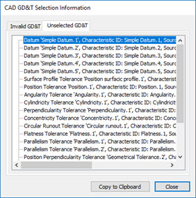 The Operation | Graphic Display Window | GD&T Selection | View Invalid GD&T for Selection menu option opens the Invalid GD&T tab on the CAD GD&T Selection Information dialog box. This tab also appears after you import CAD GD&T callouts as Edit window commands and some callouts were incomplete or invalid.