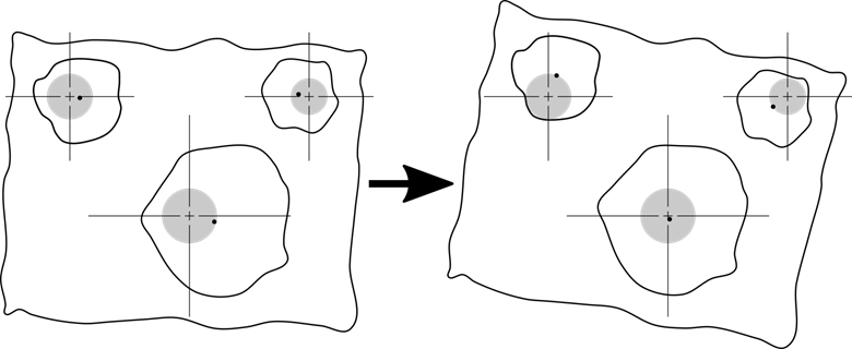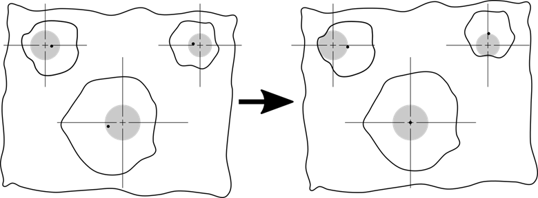 The solid lines are the actual surface, the gray shaded areas represent the datum zones, and the small dots represent the datum axis that must be in the zone. The left datum has a bigger zone because the left actual datum hole is larger. The sizes of the zones are exaggerated to show how things work.