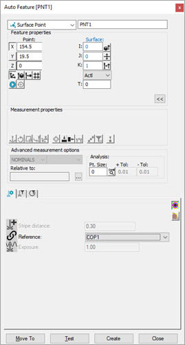 For the Eagle Eye 2 measurement, the software hides the Zoom and Gain properties and adds the Exposure and Stripe distance properties. The Scan Feature dialog box settings are the same as the settings described above for the Auto Feature dialog box.