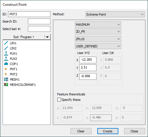 From the Feature theoreticals area, you can select the Specify theos check box. Here you can set the theoretical X, Y, Z and I, J, K values for the constructed extreme point.