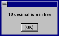 Sub Main () Dim Msg As String, x% x%=10 Msg=Str(x%) &" decimal is " Msg=Msg & Hex(x%) & " in hex " MsgBox Msg End Sub