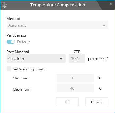 När du vill kompensera mätningen för en temperatur annat än 20°C som krävs enligt ISO-1, välj Infoga | Parameterändring | Temperaturkompensering. Följande dialogruta visas: