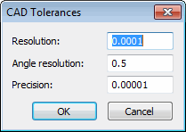 Om du väljer menyobjektet Redigera | Grafikfönster | CAD-toleranser visas dialogrutan CAD-toleranser. Med den här dialogrutan kan du visa och ändra följande CAD-toleranser som finns sparade i .CAD-filen: