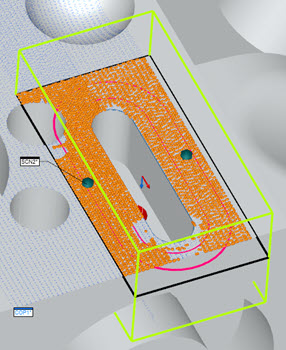 Klicka på Skapa. Baserat på parametrarna som du angav i dialogrutan utför PC-DMIS en analys av kandidatpunkterna och returnerar (eller extraherar) det rundade spåret och projicerar det på ytan. Klicka på Stäng för att stänga dialogrutan.