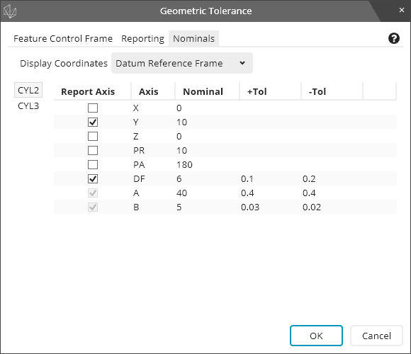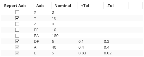 Kolumnen Nominella värden innehåller de nominella värdena för axlarna som rapporteras, och de nominella storlekarna för referenselementen med storlek.