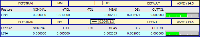 Här visas en exempelrapport på rakhetstolerans per enhet. Den övre etiketten är för den totala rakheten, och den nedre etiketten är för rakhet per enhet.
