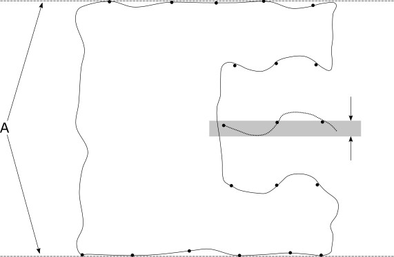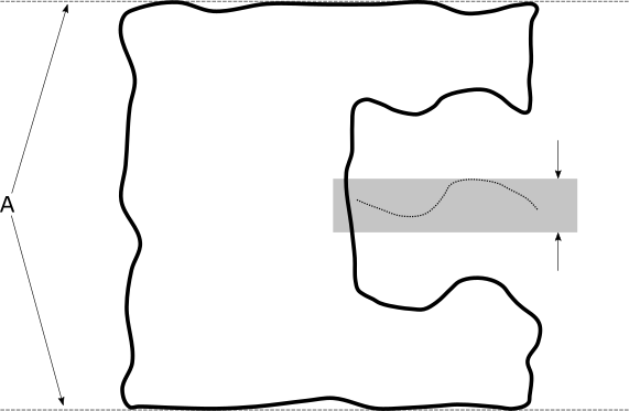 Den verkliga detaljytan representeras av den heldragna linjen, den verkliga referensen representeras av den streckade linjen, det toleranssatta elementet representeras av den prickade linjen och den minsta toleranszonen som innehåller det verkliga toleranssatta elementet visas i det skuggade området. Toleranszonen är exakt symmetrisk till mittplanet för den verkliga referensen.