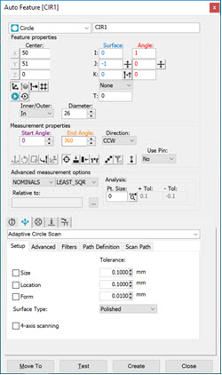 圆形自动特征对话框,带有用于自适应圆扫描的 4 轴扫描选项