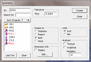 插入---尺寸---对称度菜单选项用于计算一个点特征组与基准特征的对称度,或两条反向直线与基准特征的对称度。