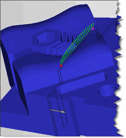 Auf dem CAD-Modell erscheint ein roter Punkt, der den Anfangspunkt darstellt, sowie ein magentafarbener Punkt, der den Endpunkt darstellt. Zusätzlich zeichnet PC-DMIS grüne Pfeile entlang des Schnitts, um anzuzeigen, wo PC-DMIS die Punkte des Profilschnitts erstellen wird. Handelt es sich um eine gekrümmte Oberfläche, werden verschiedene Pfeile gezeichnet. Ist die Oberfläche eben, zeichnet PC-DMIS die grünen Pfeile nur am Anfangs- und Endpunkt (da im Bereich Punktdichte standardmäßig Minimale Dichte ausgewählt ist).