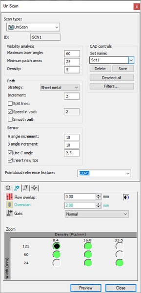 Mit UniScan können Sie automatisch Scanbefehle erstellen, die ausgewählte Flächen abdecken und dabei den maximalen Einfallswinkel des Lasersensors berücksichtigen. Sie können dann Laserspitzen und schließlich das Maschinenvolumen verwenden.