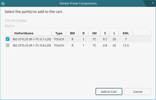 Fügen Sie den Taster und seine Komponenten dem PC-DMIS Warenkorb hinzu. Sie können die Artikel dann im Hexagon eStore kaufen oder eine Kaufanfrage erstellen.
