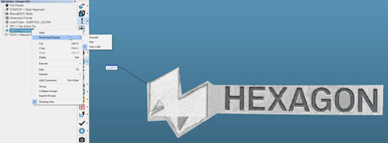 Grauskala - Diese Option ersetzt die Option Zweiseitig, wenn die Daten Intensitätswerte enthalten (z. B. gescannte Punktewolkendaten mit dem ATS600-Scanner). Diese Option steht auch zur Verfügung, wenn Sie eine Punktewolke importieren, die Intensitätswerte enthält. Wenn Sie diese Option wählen, färbt PC-DMIS die Punktewolkendarstellung im Grafikfenster in Graustufen ein.