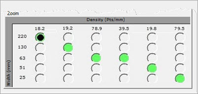 Der Bereich Zoom zeigt ein Raster von Optionsschaltflächen, die in Spalten und Zeilen angeordnet sind. Über der ersten Zeile wird die jeweilige Datendichte angezeigt. Seitlich wird neben den Zeilen die Breite des Ansichtsfelds (FOV) angezeigt. Sie können nur die richtigen Kombinationen auswählen, d. h. die grün hinterlegten Optionsschalter. Die Software deaktiviert die falschen Kombinationen.